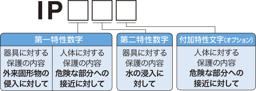 キャビネットの使用環境(屋内用キャビネットか屋外用キャビネットか)および保護等級IPを表します。 IPとはキャビネットの保護構造の等級を記号で示したものです。国際電気標準会議(IEC)の規格IEC60529(JIS C 0920)にて、危険な箇所への接近、外来固形物および水への保護の等級が規定されています。 詳細は「IP表示について」をご参照ください。